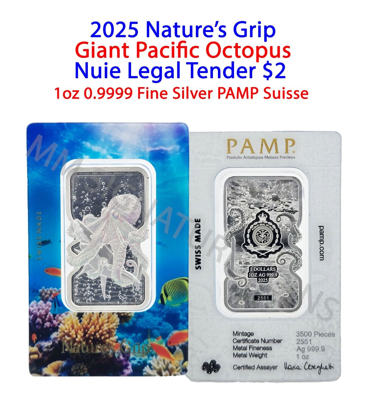 • 2025 1 oz Silver Nature's Grip Giant Octopus $2 Bar PAMP Suisse With Hologram