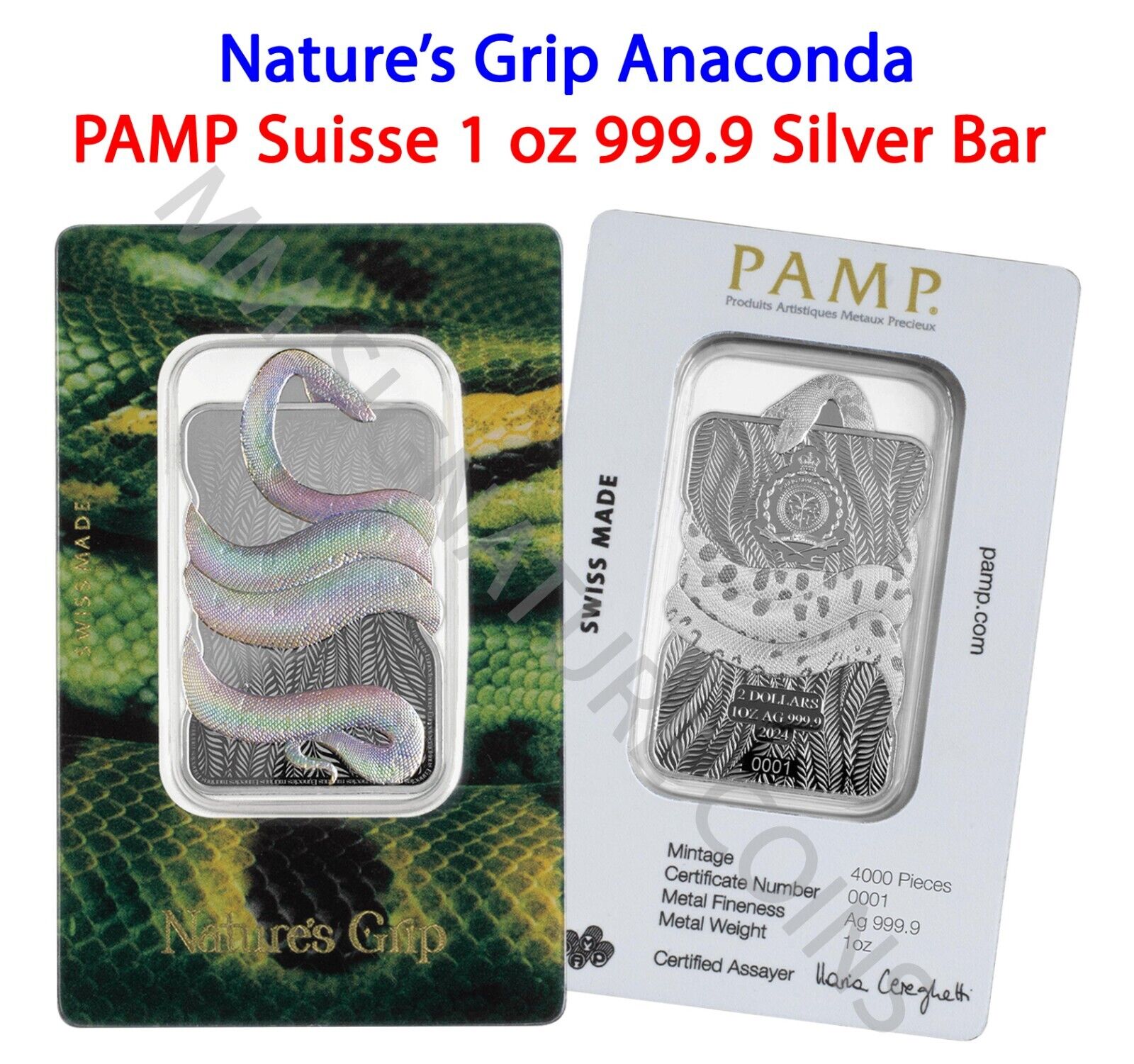 • 2024 Nature's Grip Anaconda Snake 1 oz .999 Silver Coin PAMP Suisse Ltd Ed 4000